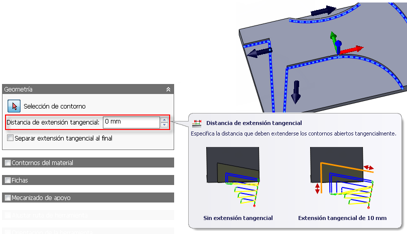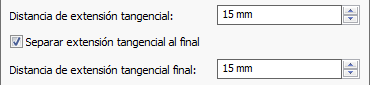 Distancia de extensión tangencial definida en 15 mm para el inicio y 5 mm para el extremo del contorno abierto