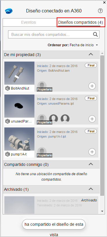 Las herramientas de administración de diseños compartidos, anteriormente solo disponibles en su A360 Drive, ahora también están disponibles en Inventor. Se encuentran en el panel Diseño compartido en A360 en la nueva ficha Diseños compartidos. Los propietarios del diseño compartido ahora pueden administrar los diseños compartidos directamente en Inventor.