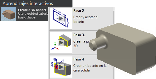 Una nuevo aprendizaje interactivo de habilidades básicas le guiará a través de los comandos y flujos de trabajo para la creación de objetos 3D en Inventor.