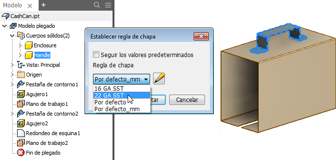 Para obtener más información, consulte Cambio de las reglas por defecto de las piezas de chapa.