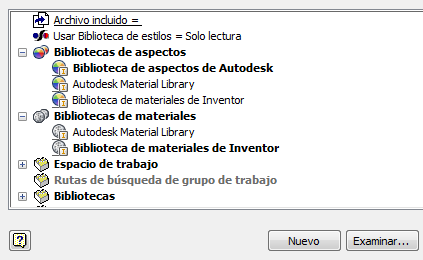 En el Editor de proyectos, el nombre de la Biblioteca activa se muestra en negrita. Si una biblioteca tiene tanto materiales como aspectos, podrá añadirla a ambas secciones de la biblioteca. Pueden activarse las dos a la vez. La biblioteca activa rellena los controles cada vez que Inventor muestra o utiliza una lista de materiales, incluida la barra de herramientas de acceso rápido (QAT). Si hay una sola biblioteca en el archivo de proyecto, por defecto será la biblioteca activa. Puede eliminar la biblioteca activa, a menos que sea la única biblioteca aparece en la lista. La biblioteca que aparece encima de la biblioteca activa hereda el estado activo.