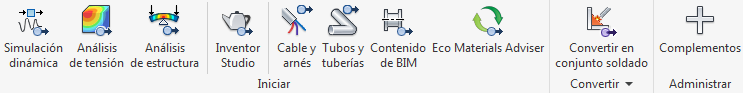 Nota: Simulación dinámica y Análisis de tensión están disponibles en los productos Autodesk Simulation y en Autodesk Inventor Professional. Cable y arnés y Tubos y tuberías solo están disponibles en Autodesk Inventor Professional.