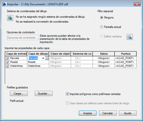 La plantilla de dibujo tiene definidas las capas de dibujo originales. Puesto que estas capas constituyen el origen de las clases de elementos que está importando, se han asignado adecuadamente.