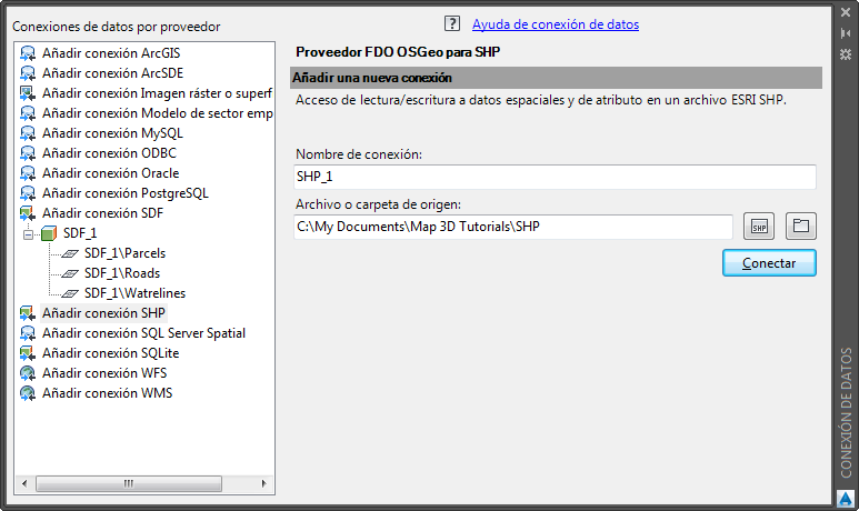 Cree una carpeta vacía nueva en la que almacenar los archivos SHP. Para convertir y copiar datos al formato SHP, debe estar conectado a esta carpeta. Para establecer conexiones con bancos de datos utiliza Conexión de datos, aunque no añada nada al mapa desde el banco de datos.