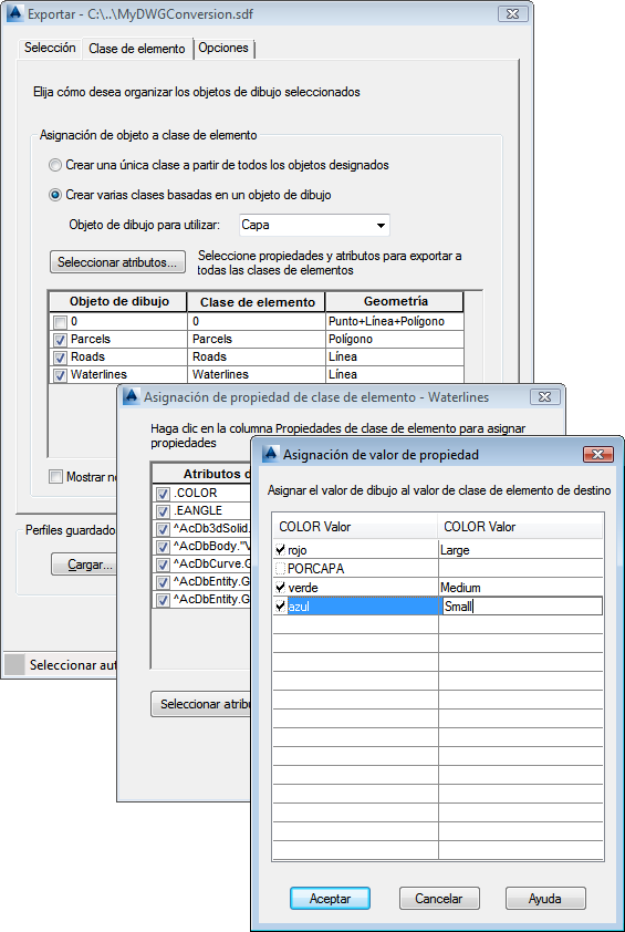 La ficha Clase de elemento también permite asignar propiedades de dibujo de AutoCAD a las propiedades de las clases de elementos SDF. Si ha utilizado colores, grosores de línea o tipos de línea para representar características del objeto dentro de una capa, puede asignar estas propiedades a las características que representan. En este dibujo, puede asignar colores a un tamaño de conducción de agua. Puede asignar cada color de conducción de agua a una propiedad de elemento independiente.