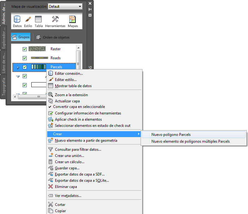 Cada elemento de AutoCAD Map 3D tiene un menú personalizado que contiene comandos disponibles para dicho elemento en ese momento.
