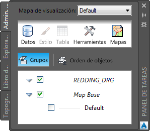 La ficha Administrador de visualización del Panel de tareas controla el estilo y la visualización de los elementos en el mapa. Las capas del Administrador de visualización son diferentes de las capas de AutoCAD, pero permiten realizar acciones similares. Por ejemplo, puede ocultar o mostrar el Administrador de visualización, incluso si dichas capas contienen imágenes ráster en lugar de objetos de dibujo.