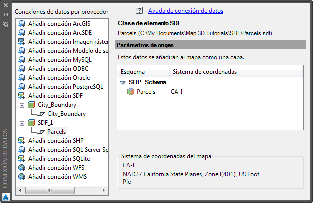 Conexión de datos muestra información acerca de todos los orígenes de datos enlazados distintos de DWG, incluso si Conexión de datos no se utilizó para enlazarlos. Por ejemplo, el archivo SDF que arrastró y soltó en el mapa aparece en la ventana Conexión de datos.