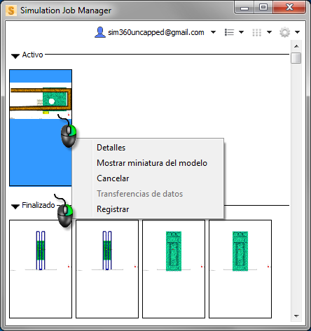 - Detalles: abre una vista de detalle del trabajo seleccionado y muestra el estado, el tipo de trabajo, la prioridad, las horas programada, de inicio y de finalización, el equipo de origen y la imagen en miniatura del modelo. Mientras se ejecuta, una barra de progreso indica el progreso de la simulación. Haga clic en Aceptar para cerrar la vista de detalle.