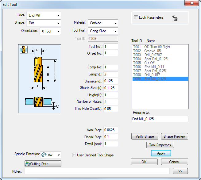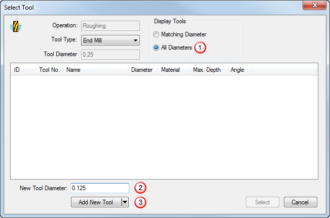 All Diameters. Notice that only a 0.156" milling cutter is available, which is too wide for the 0.125" hexagonal slot. To specify that you want to create a new 0.125" tool, complete the