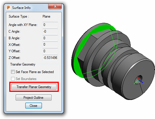 - When using a 3D solid model, you need to transfer the planar geometry from the solid model into the 2D area of the <PRODUCT> window before you can create the profile for that geometry. To transfer the geometry, double-click the surface on the solid model to display the