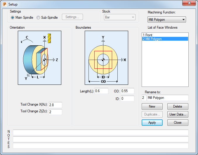 Front face window. To create a toolpath that uses a different machining function (milling), you need to create a new Face window.