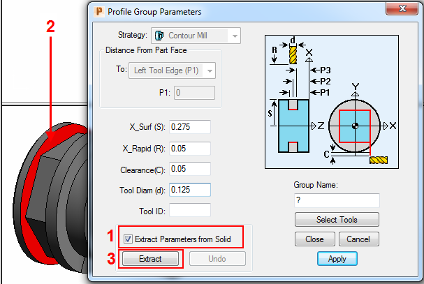 This section shows you how to create the toolpath using geometry extracted from a 3D solid model. If, however, you want to use geometry from an imported 2D