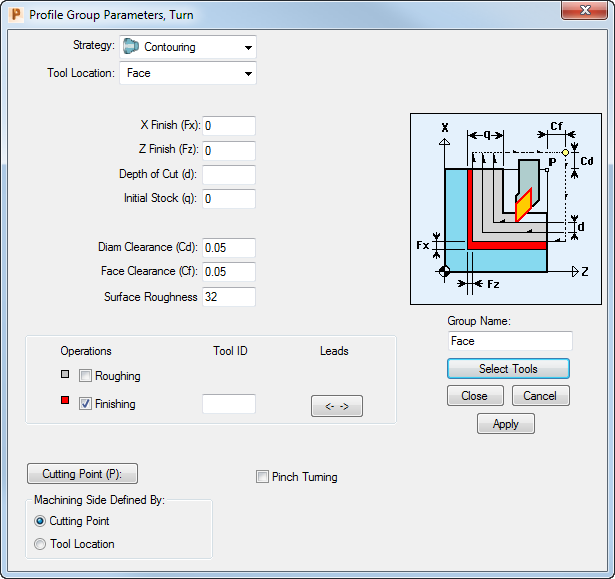 To complete the Finishing Tool ID field, click Select Tools and select T001 on the Select Tool dialog. Clicking Select closes the Select Tool dialog and returns you to the Profile Group Parameters, Turn dialog.