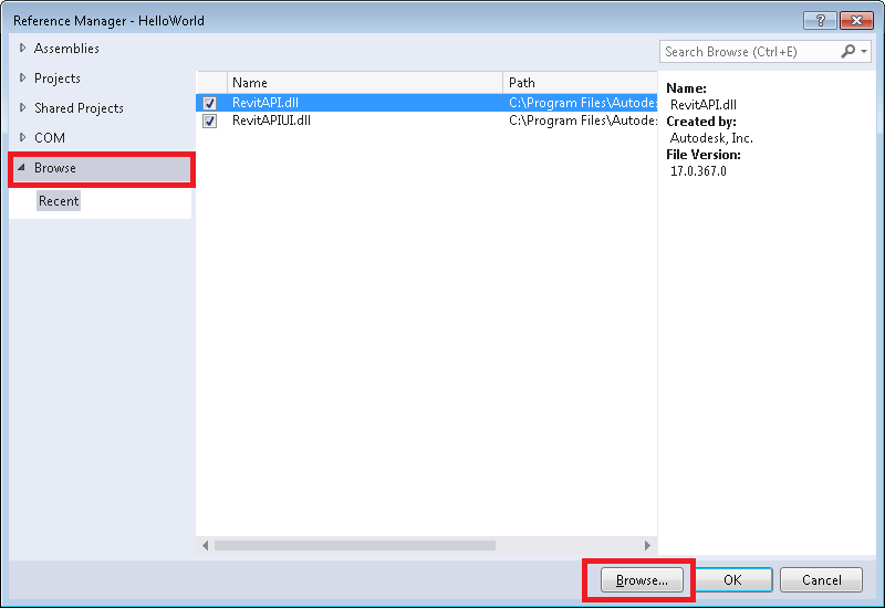 - Repeat steps above to add a reference to RevitAPIUI.dll, which is in the same folder as Revit API.dll.