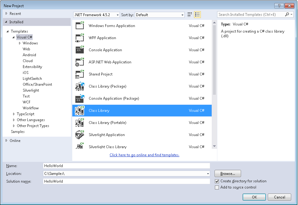 3. In the right-hand frame, click Class Library (see Figure 1: Add New Project below). This walkthrough assumes that the project location is: C:\Samples.