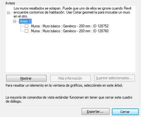 Expanda los elementos para ver los elementos individuales asociados a cada aviso. Al seleccionar el texto que se encuentra cerca del aviso, el elemento se resalta en todas las vistas abiertas en las que se muestre.