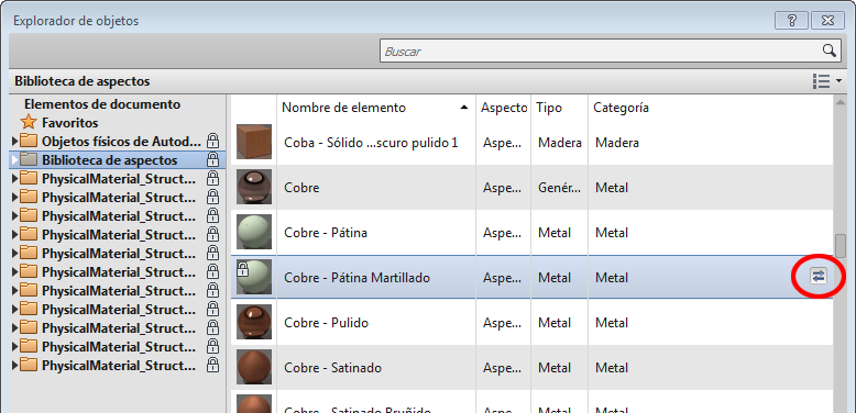 - Seleccione el material en el cuadro de diálogo Explorador de materiales.