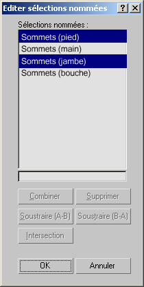 La boîte de dialogue répertorie toutes les sélections nommées au niveau de sous-objet courant. Les boutons situés sous les fenêtres vous permettent de supprimer, de fusionner et de modifier les éléments de la liste. Vous pouvez mettre en surbrillance les éléments de la liste et les sélectionner pour d'autres opérations au moyen des méthodes standard souris/clavier (avec Ctrl ou Maj).