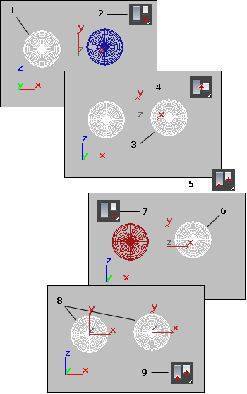 Bien que les choix de centre de transformation soient souvent utiles au niveau de l'objet, ils ne s'avèrent pas pratiques lors de la transformation de sous-objets. Pour contourner le centre de transformation actif et effectuer la transformation courante autour d'un point temporaire, utilisez des accrochages. Lorsque l'option Accrochages est activée et que votre sélection est verrouillée, le point que vous accrochez définit le point autour duquel la transformation est effectuée. L’utilisation de cette technique permet :