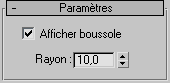 Affiche un cadran de boussole (qui ne peut pas être rendu) comportant les points Nord, Sud, Est et Ouest. La boussole fait partie d'un Système solaire ou d'un système Lumière du jour ; lorsque vous créez un système solaire, une boussole se crée automatiquement. Dans un Système solaire, l'orientation de la boussole indique l'orientation de la scène, par rapport à la trajectoire du soleil (l'écliptique).