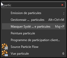 Pour rechercher une commande spécifique dans l'intégralité du système 3ds Max(menus et actions), appuyez sur la touche X lorsqu'aucun menu n'est ouvert. Cette fonction permet d'ouvrir une petite boîte de dialogue intitulée "Rechercher toutes les actions" à l'emplacement du curseur de la souris. Lorsque vous entrez le texte à rechercher, la liste déroulante qui s'ouvre dans la boîte de dialogue de recherche affiche les actions correspondantes. Pour sélectionner une action, cliquez sur son nom. Pour effacer le contenu du champ de recherche, cliquez sur l'icône en forme de croix située à l'extrémité droite de la zone de recherche. Pour quitter la recherche, choisissez une commande, cliquez en dehors de l'interface de recherche ou appuyez sur la touche Echap.