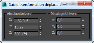 Par exemple, si la transformation Déplacement est active, les champs de la boîte de dialogue affichent les positions absolue et de décalage de l'objet sélectionné dans l'espace univers. Si aucun objet n’est sélectionné, les champs deviennent grisés.