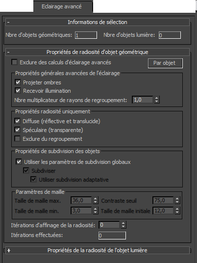 Panneau déroulant Propriétés de radiosité d'objet géométrique