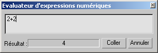 L'expression saisie est évaluée et le résultat est affiché dans le champ Résultat. Si vous cliquez sur Coller, la valeur du champ est remplacée par le résultat du calcul. Cliquez sur Annuler pour quitter l'évaluateur d'expressions.