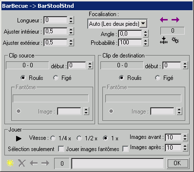 Les doubles flèches Image de la zone Fantôme vous permettent de visualiser et de faire défiler les clips source et destination en affichant des figures de base (fantômes) jaune et rouge, représentant respectivement les clips source et destination. Il est possible que les bipèdes source et destination ne soient pas rapprochés durant la visualisation. Le clip de destination sera repositionné lorsque vous cliquerez sur Définir image de début. Lorsque vous localisez une image de début appropriée, cliquez sur Définir image de début pour copier les valeurs du champ Image dans le champ Image de début. Vérifiez l'état de la position des pieds dans le champ correspondant.
