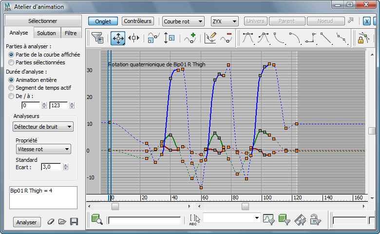 Editer des courbes de fonction au moyen des outils 3ds Max standard peut paraître difficile, en particulier si vous travaillez avec des données de capture de mouvements importées. Cette difficulté peut venir du fait que les données de capture de mouvements peuvent présenter une clé sur chaque image, ce qui rend la manipulation des courbes pénible et malaisée Il est difficile de repérer visuellement l'emplacement des points problématiques. Avec l'atelier d'animation, vous disposez de fonctions automatiques permettant de réduire les clés ou d'appliquer des filtres aux courbes de mouvements et, ainsi, de rendre l'animation plus fluide.