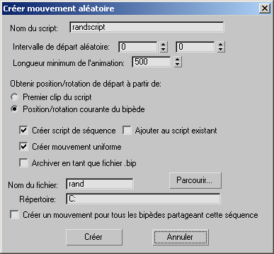 Les commandes de la boîte de dialogue Créer mouvement aléatoire vous permettent de créer un mouvement qui parcourt de manière aléatoire les clips figurant dans le schéma de séquence pour animer un ou plusieurs bipèdes. Les paramètres d'un mouvement aléatoire sont à définir dans le schéma de séquence, dans les boîtes de dialogue des clips et des transitions, ainsi que dans la boîte de dialogue Créer mouvement aléatoire.