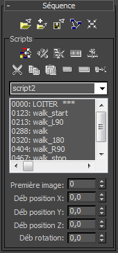 Un script est une liste de clips (fichiers .bip) qui contrôlent le personnage que vous animez. Pour créer un script, ajoutez des clips dans le schéma de séquence, puis sélectionnez Définir un script dans la section Scripts du panneau déroulant Séquence et cliquez sur une série de clips dans le schéma de séquence. Des transitions par défaut sont affectées si aucune transition n'existe entre les clips. Le nom des clips et les numéros des images de début s'affichent alors dans la liste Script de séquence.