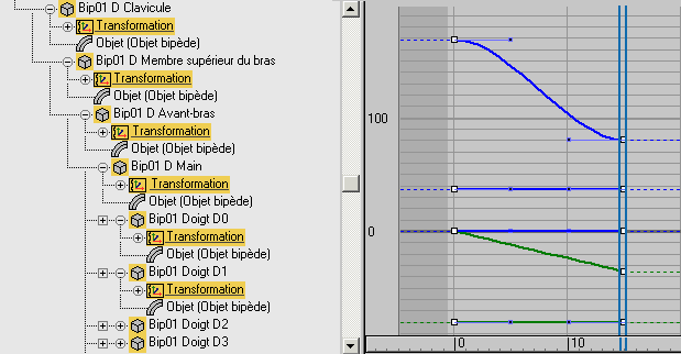Il existe une piste de doigt par main par défaut. Les clés de doigt sont stockées dans la piste de transformation Doigt0, qui correspond au premier segment du pouce du bipède.