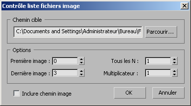 La boîte de dialogue Contrôle liste fichiers image dispose de commandes permettant de créer une liste de fichiers image (fichier IFL) qui répertorie des fichiers d'images fixes séquentielles pour le rendu dans les arrière-plans ou les matériaux. Elle est particulièrement utile si vous choisissez une séquence de fichiers situés sur un CD, car vous pouvez rediriger le fichier IFL vers un répertoire différent de votre disque dur.