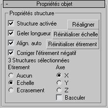Réinitialise sur 100 % l'échelle calculée en interne d'une structure étirée, pour tous les axes. L'utilisation de cette option permet d'éviter les comportements inattendus dus aux objets liés qui sont mis à l'échelle. Cette option n'a aucun effet visuel sur la structure.