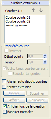 Ces commandes, à la différence des propriétés générales de la surface d'extrusion, ont un effet sur les courbes individuelles que vous sélectionnez dans la liste Courbes U. Elles ne sont activées que si vous avez sélectionné une courbe dans la liste Courbes U.