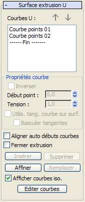 Ajoute une courbe à la surface d'extrusion U. Cliquez sur insérer, puis sur la courbe. La courbe est insérée avant la courbe sélectionnée. Pour insérer une courbe à la fin, commencez par sélectionner " ----Fin----- " dans la liste.