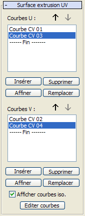 Lorsque vous cliquez sur les courbes, leur nom s'affiche dans les listes du panneau déroulant Création de surface d'extrusion UV. L’ordre de sélection des courbes peut affecter la forme de la surface extrusion UV.