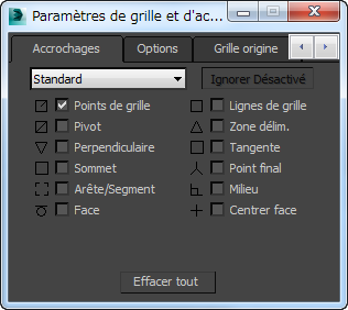 Par défaut, la boîte de dialogue s'ouvre dans le panneau Accrochages avec la catégorie Standard active et l'option Points de grille activée.