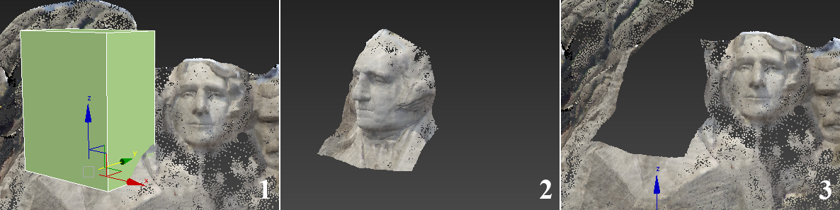 2 : zone utilisée en tant que volume d'affichage avec l'option Inverser désactivée (configuration par défaut), puis masquée. Seuls les points situés à l'intérieur de la zone sont visibles.