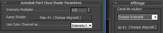 - Rampe Intensité applique une texture à partir d'une texture Rampe dégradé à l'objet nuage de points en fonction des valeurs de luminance dans le nuage de points d'origine. Le point le plus à gauche du dégradé correspond aux zones les plus sombres de la couleur d'origine de l'objet nuage de points et le point le plus à droite correspond aux zones les plus lumineuses de l'objet nuage de points.