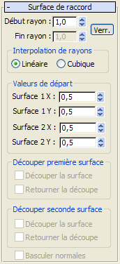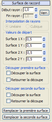 Ce groupe contrôle le rayon du raccord. La valeur d'interpolation de rayons reste inopérante, sauf si la surface ou les deux surfaces constituant le raccord incluent une courbure.