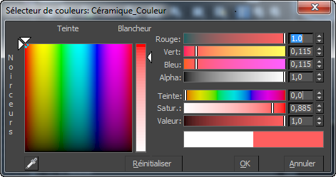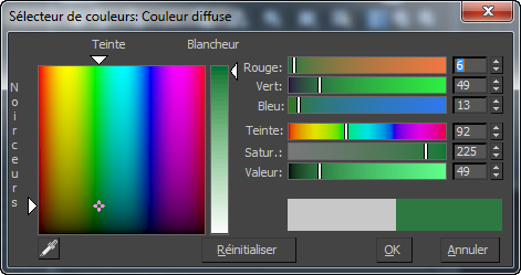 La boîte de dialogue Sélecteur de couleurs vous permet de définir une couleur personnalisée dans 3ds Max. Vous pouvez travailler avec trois modèles de couleurs simultanément pour identifier celle que vous souhaitez utiliser.