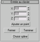 Permet d'utiliser une spline en tant que trajectoire de mur. Cliquez sur cette option, puis cliquez dans la fenêtre sur une spline à utiliser comme trajectoire de mur. 3ds Max utilise la spline en tant que trajectoire le long de laquelle l'objet mur est appliqué. 3ds Max ne reconnaît pas immédiatement les formes 2D provenant d'un dessin AutoCAD lié. Pour qu'une forme provenant d'un dessin AutoCAD lié soit reconnue, modifiez la forme à l'aide de l'option Editer spline du groupe de fonctions Modifier.