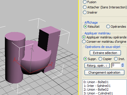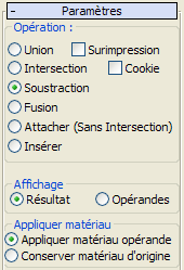 (Lancer la sélection) cliquez ici puis cliquez sur chaque opérande pour les transférer tour à tour vers l'objet booléen. Avant de sélectionner chaque opérande, vous pouvez modifier le choix Référence/Copier/Déplacer/Instance, les options d'Opération, et le choix de la fonction Appliquer Matériau.