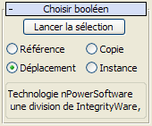 • Instextrait une instance du ou des opérande(s) sélectionné(s) dans la liste de vue hiérarchique. Toute modification ultérieure à cet opérande extrait modifie également l'opérande d'origine, et affecte donc l'objet booléen.