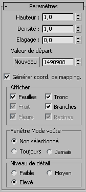 Vous pouvez contrôler la hauteur, la densité, l'élagage, l'affichage sous forme de voûte et le niveau de détail de ces objets. Les options de valeur de départ permettent la création de représentations différentes d'une même espèce. Il est possible de créer des millions de variantes d'une même espèce, afin que chaque objet soit unique. L'option Fenêtre Mode voûte permet de définir la quantité de détail d'une plante, en réduisant le nombre de sommets et de faces utilisés par 3ds Max pour l'affichage de la plante.