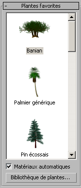 Matériaux automatiques est activée, chaque plante est affectée d'un matériau par défaut. Pour plus d'informations, reportez-vous à la rubrique Panneau déroulant Plantes favorites, ci-dessous.
