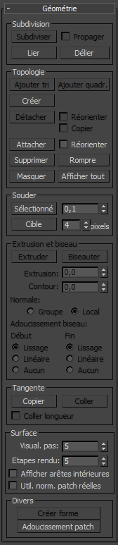 Pour obtenir une description détaillée de ces commandes, reportez-vous à la rubrique Panneau déroulant Géométrie (Patch).